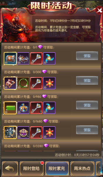 活动简介:活动期间,累计充值达到一定金额,可领取游戏为你准备的返利豪礼