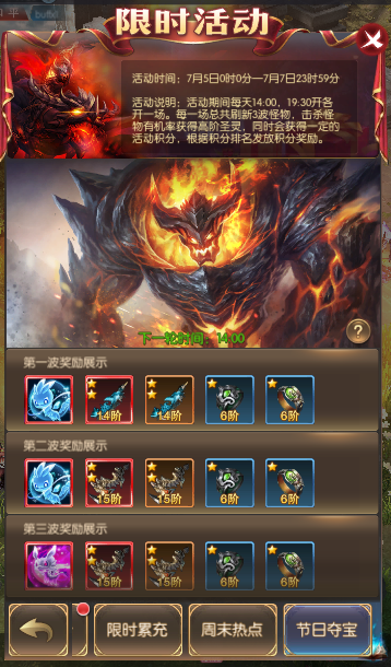 活动简介:活动期间每天14:00,19:30开各开一场。每一场总共刷新3波怪物,击杀怪物有获得高阶圣灵,同时会获得一定的活动积分,根据积分排名发放积分奖励。