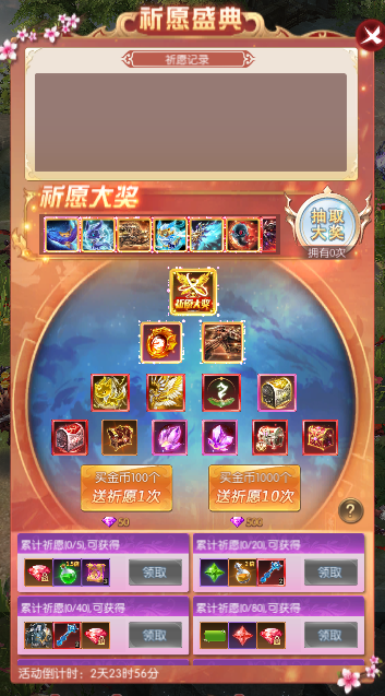 活动简介:活动期间可以消耗钻石购买金币进行祈愿,每次购买会赠送一个祈愿奖励 ;在奖池中抽到祈愿盛典大奖后,可在上方祈愿大奖奖池中抽取一次极品奖励(必然获得奖池中的极品奖励之一) ;祈愿达到累计次数可以获得对应的次数奖励,奖励多多 ;活动期间祈愿累计次数不会重置,活动结束后重置