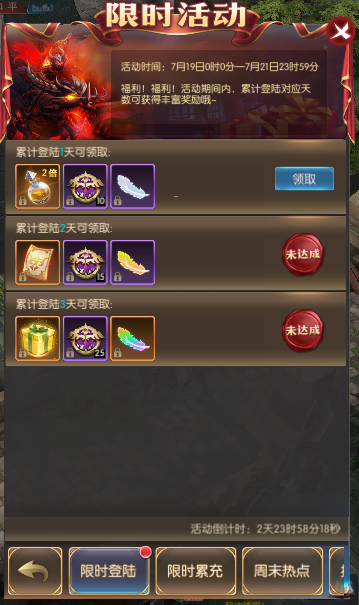 活动简介:福利!福利!活动期间内,累计登陆对应天数可获得丰富奖励哦~