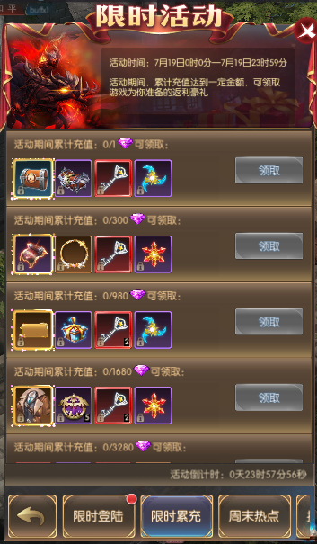 活动简介:活动期间,累计充值达到一定金额,可领取游戏为你准备的返利豪礼