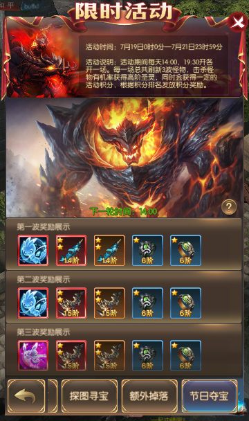 活动简介:活动期间每天14:00,19:30开各开一场。每一场总共刷新3波怪物,击杀怪物有获得高阶圣灵,同时会获得一定的活动积分,根据积分排名发放积分奖励。