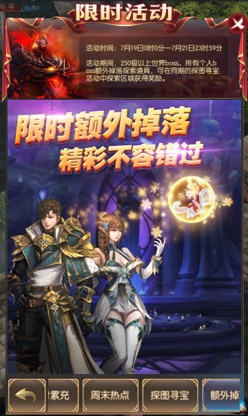 活动简介:活动期间,250级以上世界boss、所有个人boss额外掉落探索道具,可在同期的探图寻宝活动中探索区域获得奖励。