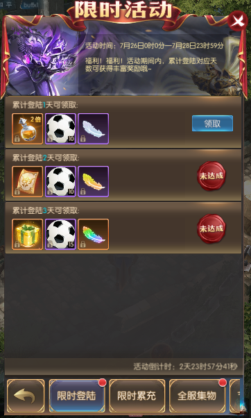 累计登陆3天 | 疲劳礼盒,热火足球*25,神圣之羽 |