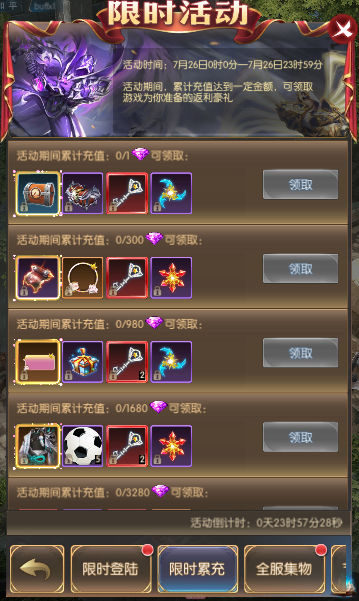 活动简介:活动期间,累计充值达到一定金额,可领取游戏为你准备的返利豪礼