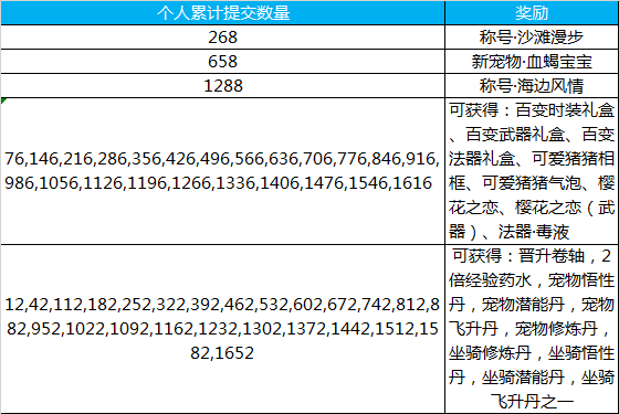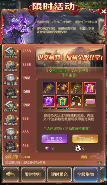 活动简介:提交指定材料,获得惊喜奖励,全服达到指定数量可激活全服奖励!