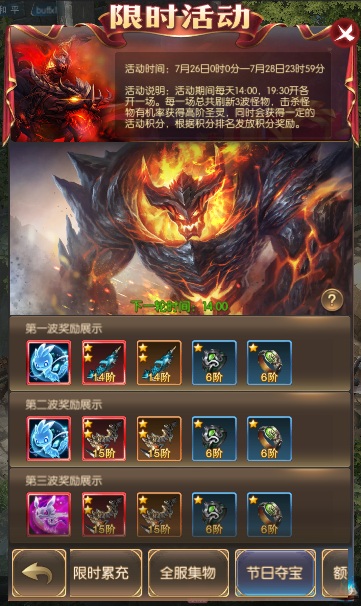 活动简介:活动期间每天14:00,19:30开各开一场。每一场总共刷新3波怪物,击杀怪物有获得高阶圣灵,同时会获得一定的活动积分,根据积分排名发放积分奖励。