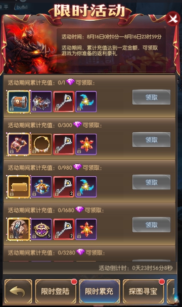 活动简介:活动期间,累计充值达到一定金额,可领取游戏为你准备的返利豪礼