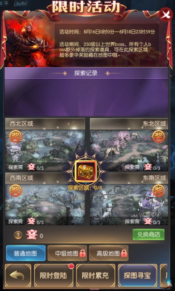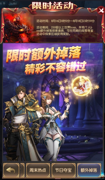 活动简介:活动期间,250级以上世界boss、所有个人boss额外掉落探索道具,可在同期的探图寻宝活动中探索区域获得奖励。