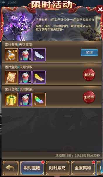 活动简介:福利!福利!活动期间内,累计登陆对应天数可获得丰富奖励哦~