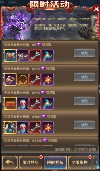 活动简介:活动期间,累计充值达到一定金额,可领取游戏为你准备的返利豪礼