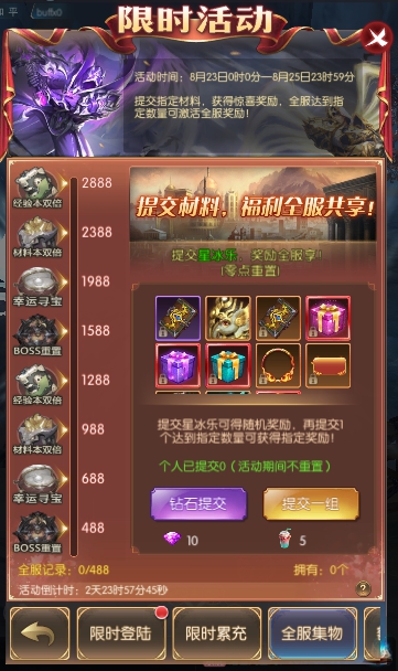 活动简介:提交指定材料,获得惊喜奖励,全服达到指定数量可激活全服奖励!