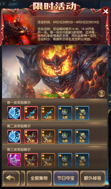 活动简介:活动期间每天14:00,19:30开各开一场。每一场总共刷新3波怪物,击杀怪物有获得高阶圣灵,同时会获得一定的活动积分,根据积分排名发放积分奖励。