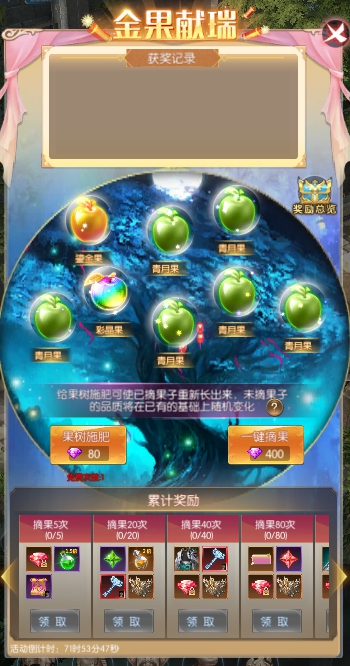 1.点击果树上的果子可以摘下果子,获得对应的奖励