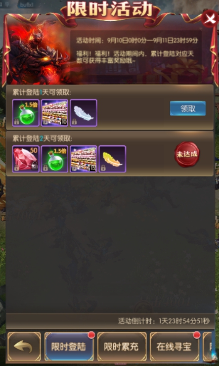 活动简介:福利!福利!活动期间内,累计登陆对应天数可获得丰富奖励哦~