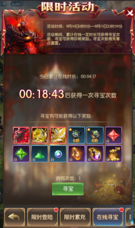 活动简介:活动期间,累计在线一定时常可获得寻宝次数,寻宝可获得珍稀奖励。寻宝次数每天零点重置。