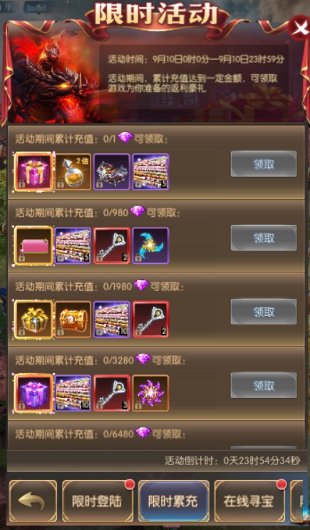 活动简介:活动期间,累计充值达到一定金额,可领取游戏为你准备的返利豪礼