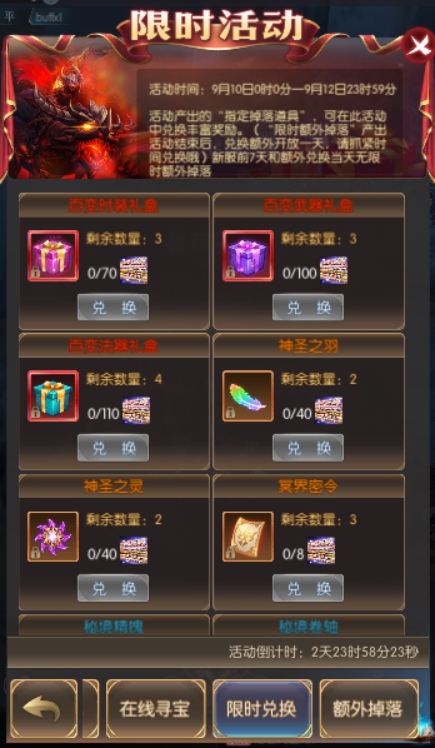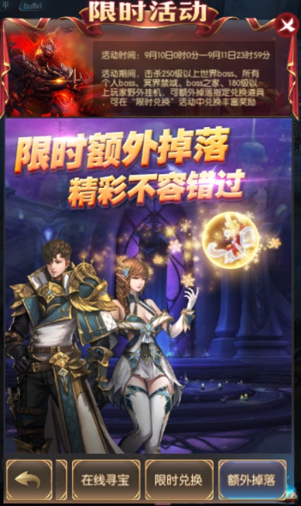 活动简介:活动期间,击杀250级以上世界boss、所有个人boss、冥界禁域、boss之家可额外掉落指定兑换道具,可在“限时兑换”活动中兑换丰富奖励;180级以上玩家野外挂机可额外掉落指定兑换道具,可在“限时兑换”活动中兑换丰富奖励