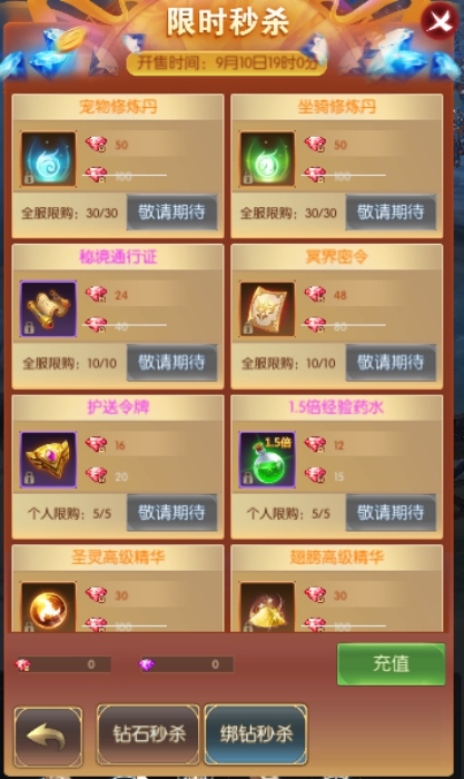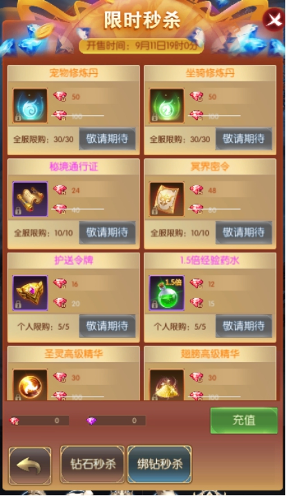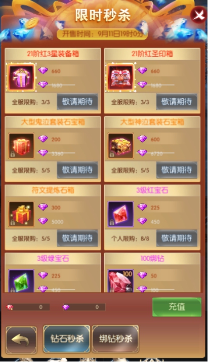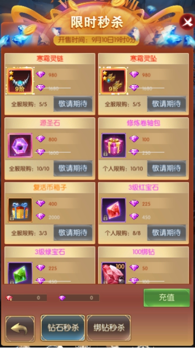 活动简介:活动期间,玩家能以超低的价格秒杀原价道具,机会不容错过。