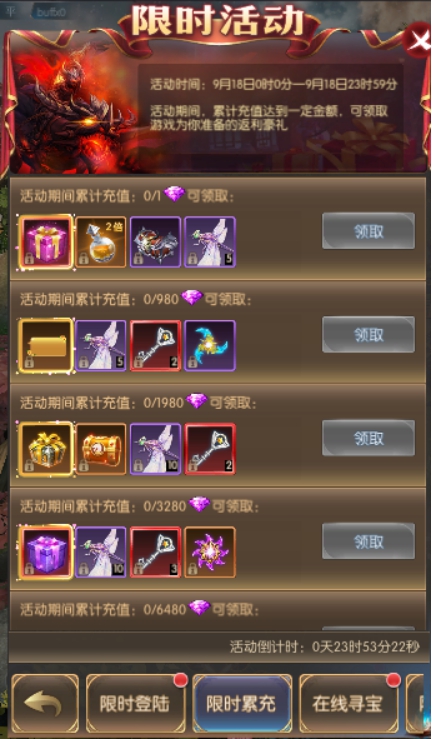 活动简介:活动期间,累计充值达到一定金额,可领取游戏为你准备的返利豪礼