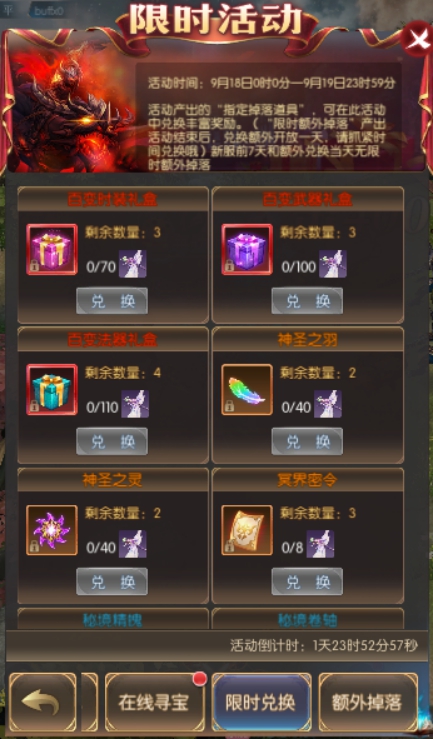 活动简介:活动期间,击杀250级以上世界boss、所有个人boss、冥界禁域、boss之家可额外掉落指定兑换道具,可在“限时兑换”活动中兑换丰富奖励;180级以上玩家野外挂机可额外掉落指定兑换道具,可在“限时兑换”活动中兑换丰富奖励