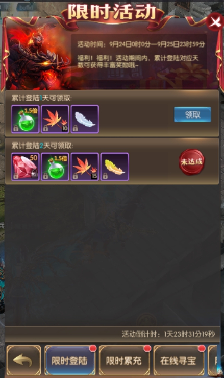 活动简介:福利!福利!活动期间内,累计登陆对应天数可获得丰富奖励哦~