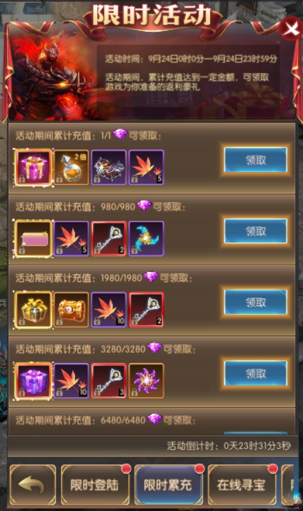 活动简介:活动期间,累计充值达到一定金额,可领取游戏为你准备的返利豪礼