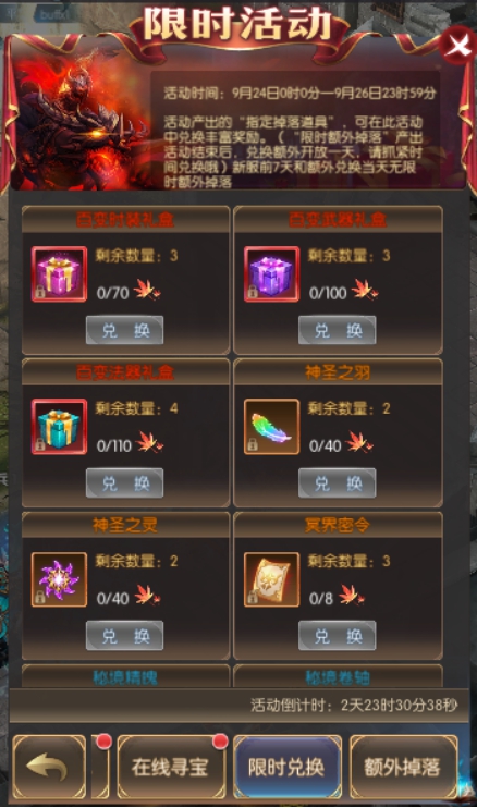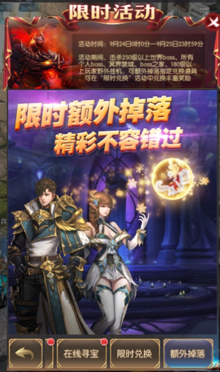 活动简介:活动期间,击杀250级以上世界boss、所有个人boss、冥界禁域、boss之家可额外掉落指定兑换道具,可在“限时兑换”活动中兑换丰富奖励;180级以上玩家野外挂机可额外掉落指定兑换道具,可在“限时兑换”活动中兑换丰富奖励
