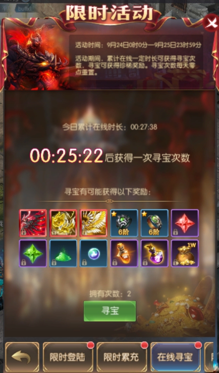 活动简介:活动期间,累计在线一定时常可获得寻宝次数,寻宝可获得珍稀奖励。寻宝次数每天零点重置。