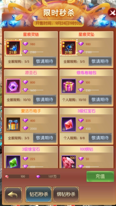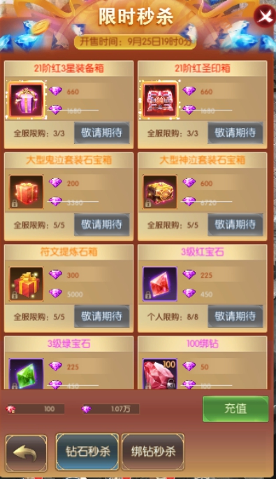 活动简介:活动期间,玩家能以超低的价格秒杀原价道具,机会不容错过。