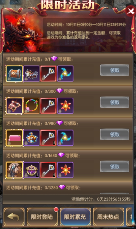 活动简介:活动期间,累计充值达到一定金额,可领取游戏为你准备的返利豪礼