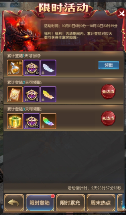 活动简介:福利!福利!活动期间内,累计登陆对应天数可获得丰富奖励哦~