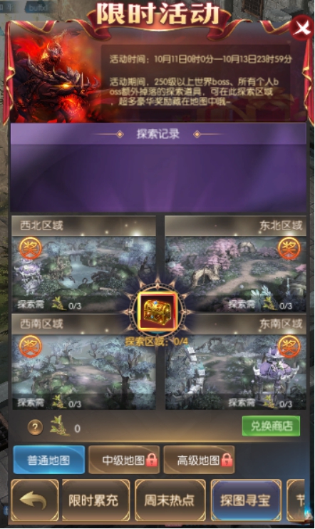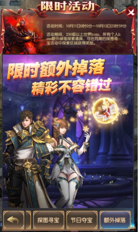 活动简介:活动期间,250级以上世界boss、所有个人boss额外掉落探索道具,可在同期的探图寻宝活动中探索区域获得奖励。