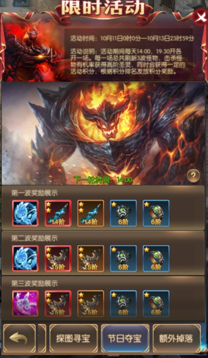 活动简介:活动期间每天14:00,19:30开各开一场。每一场总共刷新3波怪物,击杀怪物有获得高阶圣灵,同时会获得一定的活动积分,根据积分排名发放积分奖励。