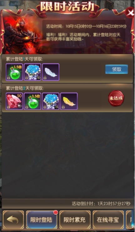活动简介:福利!福利!活动期间内,累计登陆对应天数可获得丰富奖励哦~