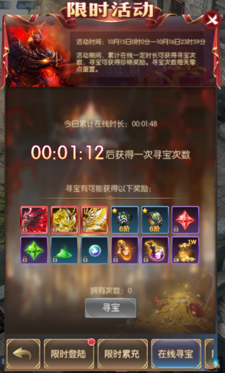 活动简介:活动期间,累计在线一定时常可获得寻宝次数,寻宝可获得珍稀奖励。寻宝次数每天零点重置。