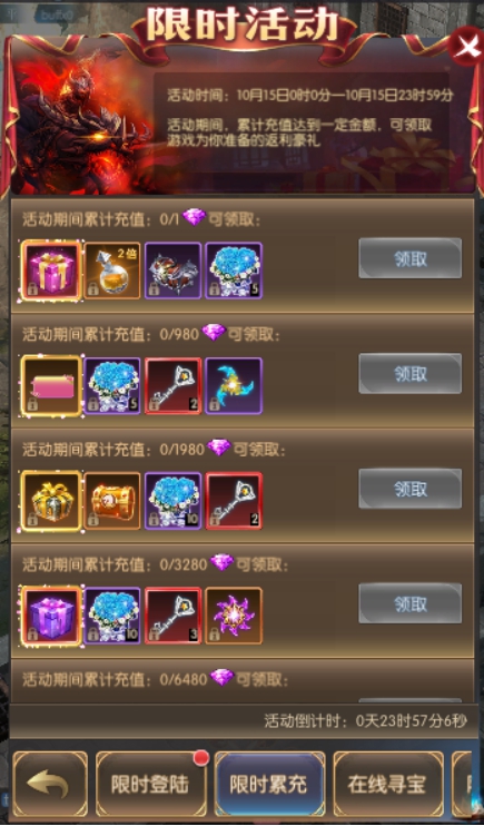 活动简介:活动期间,累计充值达到一定金额,可领取游戏为你准备的返利豪礼