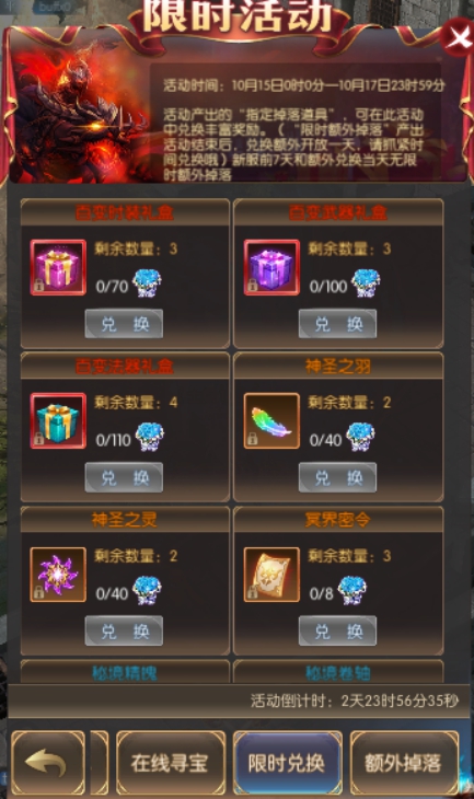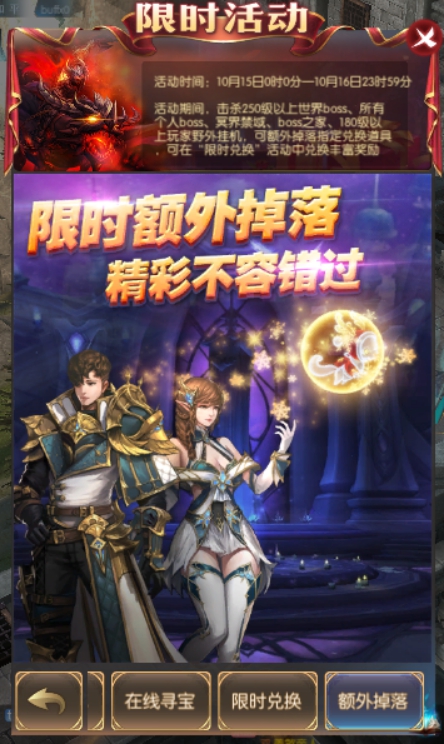 活动简介:活动期间,击杀250级以上世界boss、所有个人boss、冥界禁域、boss之家可额外掉落指定兑换道具,可在“限时兑换”活动中兑换丰富奖励;180级以上玩家野外挂机可额外掉落指定兑换道具,可在“限时兑换”活动中兑换丰富奖励