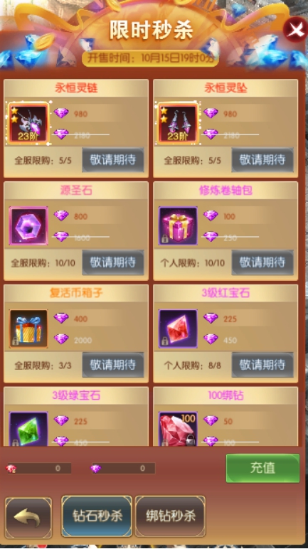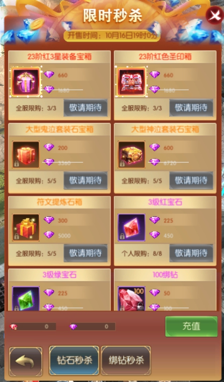 活动简介:活动期间,玩家能以超低的价格秒杀原价道具,机会不容错过。