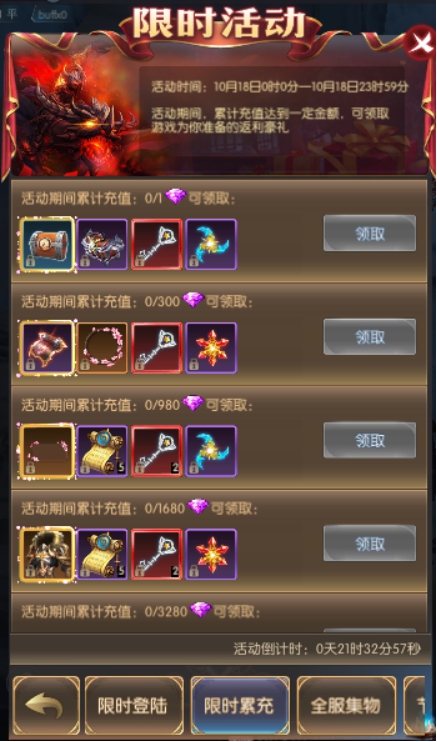 活动简介:活动期间,累计充值达到一定金额,可领取游戏为你准备的返利豪礼