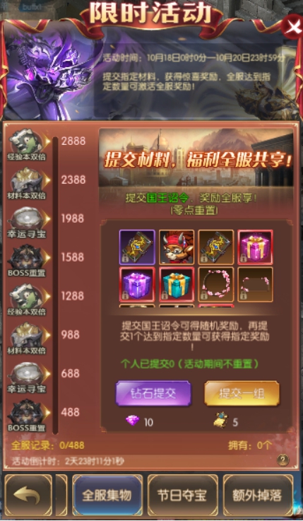 活动简介:提交指定材料,获得惊喜奖励,全服达到指定数量可激活全服奖励!