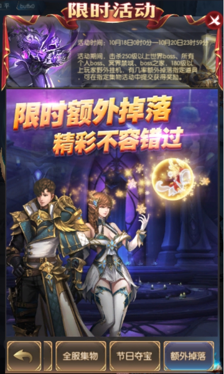 活动简介:活动期间,击杀250级以上世界boss、所有个人boss、冥界禁域、boss之家。180级以上玩家野外挂机有额外掉落指定道具,可在指定全服集物活动中提交获得奖励。