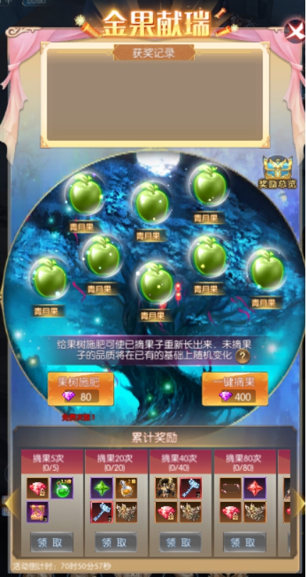 1.点击果树上的果子可以摘下果子,获得对应的奖励