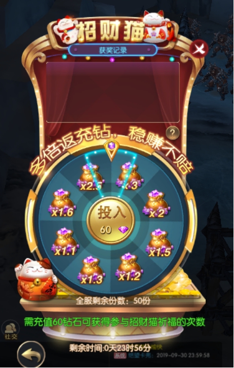 2.每个档位的招财猫每位玩家只能参与一次,并且全服有一定的参与份数总数,以上两个份数任意一个被买完则会自动进入下一档