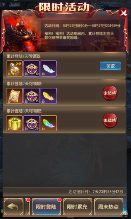 累计登陆3天 | 疲劳礼盒,热点*25,神圣之羽 |