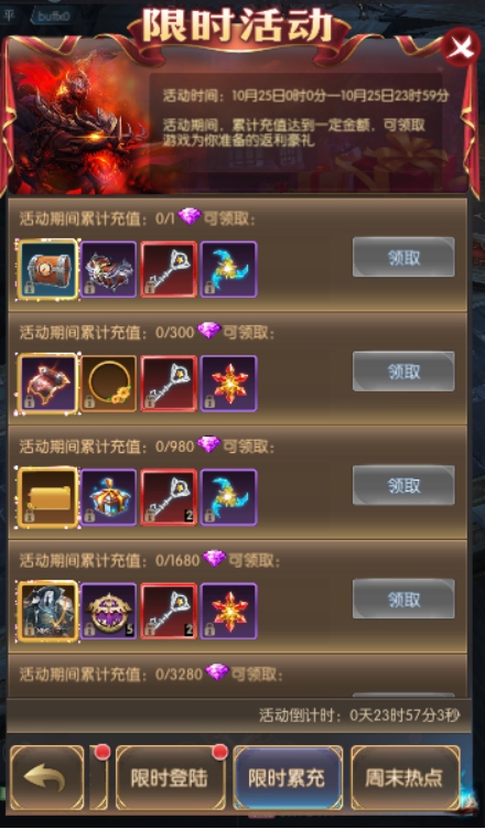 活动简介:活动期间,累计充值达到一定金额,可领取游戏为你准备的返利豪礼