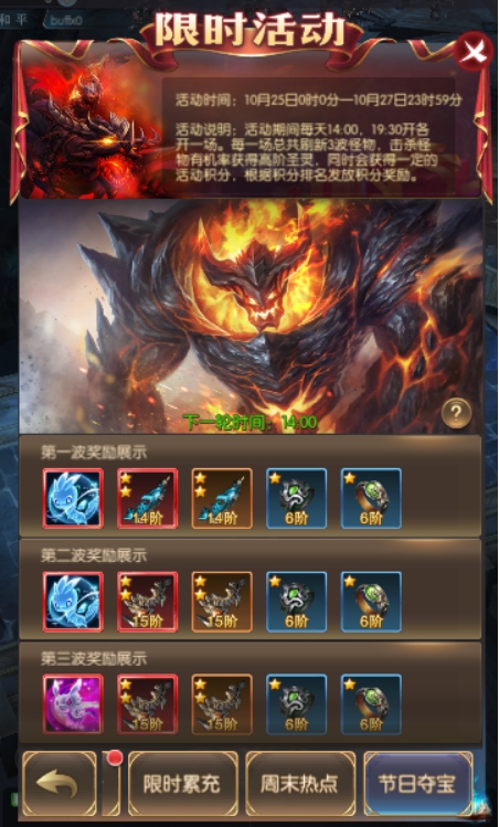 活动简介:活动期间每天14:00,19:30开各开一场。每一场总共刷新3波怪物,击杀怪物有获得高阶圣灵,同时会获得一定的活动积分,根据积分排名发放积分奖励。