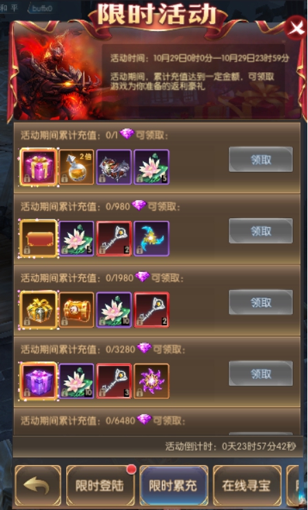 活动简介:活动期间,累计充值达到一定金额,可领取游戏为你准备的返利豪礼