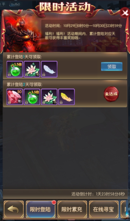 活动简介:福利!福利!活动期间内,累计登陆对应天数可获得丰富奖励哦~