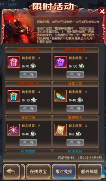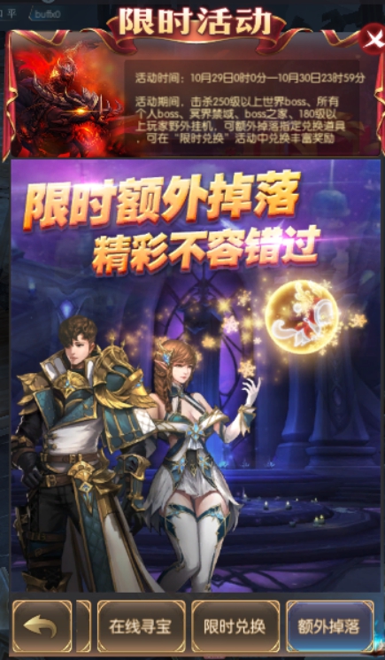活动简介:活动期间,击杀250级以上世界boss、所有个人boss、冥界禁域、boss之家可额外掉落指定兑换道具,可在“限时兑换”活动中兑换丰富奖励;180级以上玩家野外挂机可额外掉落指定兑换道具,可在“限时兑换”活动中兑换丰富奖励